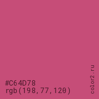 Цвет #C64D78 в цветовой модели RGB обозначается тремя октетами (198, 77, 120) в десятичном формате и #C64D78 в шестнадцатиричном (hex) формате, которые являются интенсивностью красного 198 (hex C6), интенсивность зелёного 77 (hex 4D) и интенсивность синего 120 (hex 78).