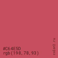 Цвет #C64E5D в цветовой модели RGB обозначается тремя октетами (198, 78, 93) в десятичном формате и #C64E5D в шестнадцатиричном (hex) формате, которые являются интенсивностью красного 198 (hex C6), интенсивность зелёного 78 (hex 4E) и интенсивность синего 93 (hex 5D).