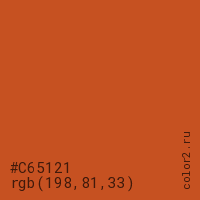 Цвет #C65121 в цветовой модели RGB обозначается тремя октетами (198, 81, 33) в десятичном формате и #C65121 в шестнадцатиричном (hex) формате, которые являются интенсивностью красного 198 (hex C6), интенсивность зелёного 81 (hex 51) и интенсивность синего 33 (hex 21).
