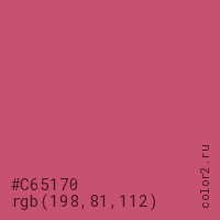 Цвет #C65170 в цветовой модели RGB обозначается тремя октетами (198, 81, 112) в десятичном формате и #C65170 в шестнадцатиричном (hex) формате, которые являются интенсивностью красного 198 (hex C6), интенсивность зелёного 81 (hex 51) и интенсивность синего 112 (hex 70).