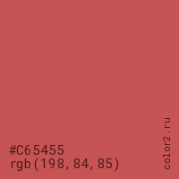Цвет #C65455 в цветовой модели RGB обозначается тремя октетами (198, 84, 85) в десятичном формате и #C65455 в шестнадцатиричном (hex) формате, которые являются интенсивностью красного 198 (hex C6), интенсивность зелёного 84 (hex 54) и интенсивность синего 85 (hex 55).