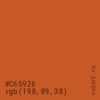 Цвет #C65926 в цветовой модели RGB обозначается тремя октетами (198, 89, 38) в десятичном формате и #C65926 в шестнадцатиричном (hex) формате, которые являются интенсивностью красного 198 (hex C6), интенсивность зелёного 89 (hex 59) и интенсивность синего 38 (hex 26).