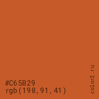 Цвет #C65B29 в цветовой модели RGB обозначается тремя октетами (198, 91, 41) в десятичном формате и #C65B29 в шестнадцатиричном (hex) формате, которые являются интенсивностью красного 198 (hex C6), интенсивность зелёного 91 (hex 5B) и интенсивность синего 41 (hex 29).