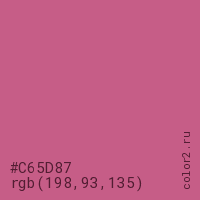 Цвет #C65D87 в цветовой модели RGB обозначается тремя октетами (198, 93, 135) в десятичном формате и #C65D87 в шестнадцатиричном (hex) формате, которые являются интенсивностью красного 198 (hex C6), интенсивность зелёного 93 (hex 5D) и интенсивность синего 135 (hex 87).