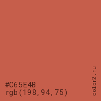 Цвет #C65E4B в цветовой модели RGB обозначается тремя октетами (198, 94, 75) в десятичном формате и #C65E4B в шестнадцатиричном (hex) формате, которые являются интенсивностью красного 198 (hex C6), интенсивность зелёного 94 (hex 5E) и интенсивность синего 75 (hex 4B).