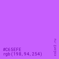 Цвет #C65EFE в цветовой модели RGB обозначается тремя октетами (198, 94, 254) в десятичном формате и #C65EFE в шестнадцатиричном (hex) формате, которые являются интенсивностью красного 198 (hex C6), интенсивность зелёного 94 (hex 5E) и интенсивность синего 254 (hex FE).