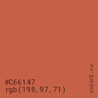 Цвет #C66147 в цветовой модели RGB обозначается тремя октетами (198, 97, 71) в десятичном формате и #C66147 в шестнадцатиричном (hex) формате, которые являются интенсивностью красного 198 (hex C6), интенсивность зелёного 97 (hex 61) и интенсивность синего 71 (hex 47).