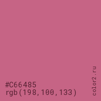 Цвет #C66485 в цветовой модели RGB обозначается тремя октетами (198, 100, 133) в десятичном формате и #C66485 в шестнадцатиричном (hex) формате, которые являются интенсивностью красного 198 (hex C6), интенсивность зелёного 100 (hex 64) и интенсивность синего 133 (hex 85).