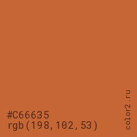 Цвет #C66635 в цветовой модели RGB обозначается тремя октетами (198, 102, 53) в десятичном формате и #C66635 в шестнадцатиричном (hex) формате, которые являются интенсивностью красного 198 (hex C6), интенсивность зелёного 102 (hex 66) и интенсивность синего 53 (hex 35).