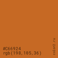 Цвет #C66924 в цветовой модели RGB обозначается тремя октетами (198, 105, 36) в десятичном формате и #C66924 в шестнадцатиричном (hex) формате, которые являются интенсивностью красного 198 (hex C6), интенсивность зелёного 105 (hex 69) и интенсивность синего 36 (hex 24).