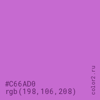 Цвет #C66AD0 в цветовой модели RGB обозначается тремя октетами (198, 106, 208) в десятичном формате и #C66AD0 в шестнадцатиричном (hex) формате, которые являются интенсивностью красного 198 (hex C6), интенсивность зелёного 106 (hex 6A) и интенсивность синего 208 (hex D0).