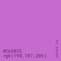 Цвет #C66BCE в цветовой модели RGB обозначается тремя октетами (198, 107, 206) в десятичном формате и #C66BCE в шестнадцатиричном (hex) формате, которые являются интенсивностью красного 198 (hex C6), интенсивность зелёного 107 (hex 6B) и интенсивность синего 206 (hex CE).
