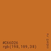 Цвет #C66D26 в цветовой модели RGB обозначается тремя октетами (198, 109, 38) в десятичном формате и #C66D26 в шестнадцатиричном (hex) формате, которые являются интенсивностью красного 198 (hex C6), интенсивность зелёного 109 (hex 6D) и интенсивность синего 38 (hex 26).