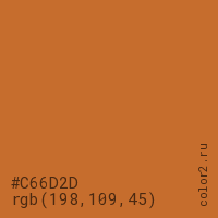 Цвет #C66D2D в цветовой модели RGB обозначается тремя октетами (198, 109, 45) в десятичном формате и #C66D2D в шестнадцатиричном (hex) формате, которые являются интенсивностью красного 198 (hex C6), интенсивность зелёного 109 (hex 6D) и интенсивность синего 45 (hex 2D).