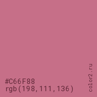 Цвет #C66F88 в цветовой модели RGB обозначается тремя октетами (198, 111, 136) в десятичном формате и #C66F88 в шестнадцатиричном (hex) формате, которые являются интенсивностью красного 198 (hex C6), интенсивность зелёного 111 (hex 6F) и интенсивность синего 136 (hex 88).