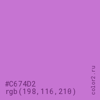 Цвет #C674D2 в цветовой модели RGB обозначается тремя октетами (198, 116, 210) в десятичном формате и #C674D2 в шестнадцатиричном (hex) формате, которые являются интенсивностью красного 198 (hex C6), интенсивность зелёного 116 (hex 74) и интенсивность синего 210 (hex D2).