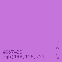 Цвет #C674DC в цветовой модели RGB обозначается тремя октетами (198, 116, 220) в десятичном формате и #C674DC в шестнадцатиричном (hex) формате, которые являются интенсивностью красного 198 (hex C6), интенсивность зелёного 116 (hex 74) и интенсивность синего 220 (hex DC).
