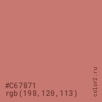 Цвет #C67871 в цветовой модели RGB обозначается тремя октетами (198, 120, 113) в десятичном формате и #C67871 в шестнадцатиричном (hex) формате, которые являются интенсивностью красного 198 (hex C6), интенсивность зелёного 120 (hex 78) и интенсивность синего 113 (hex 71).