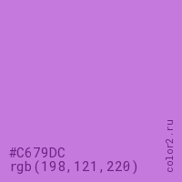 Цвет #C679DC в цветовой модели RGB обозначается тремя октетами (198, 121, 220) в десятичном формате и #C679DC в шестнадцатиричном (hex) формате, которые являются интенсивностью красного 198 (hex C6), интенсивность зелёного 121 (hex 79) и интенсивность синего 220 (hex DC).