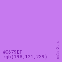 Цвет RGB(198, 121, 239) в процентом отношении количества цвета состоит из 77.6% красного (red), 47.5% зелёного (green) и 93.7% синего (blue).