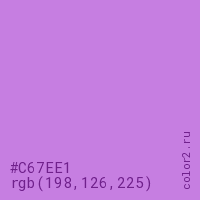 Цвет #C67EE1 в цветовой модели RGB обозначается тремя октетами (198, 126, 225) в десятичном формате и #C67EE1 в шестнадцатиричном (hex) формате, которые являются интенсивностью красного 198 (hex C6), интенсивность зелёного 126 (hex 7E) и интенсивность синего 225 (hex E1).