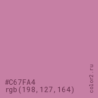 Цвет #C67FA4 в цветовой модели RGB обозначается тремя октетами (198, 127, 164) в десятичном формате и #C67FA4 в шестнадцатиричном (hex) формате, которые являются интенсивностью красного 198 (hex C6), интенсивность зелёного 127 (hex 7F) и интенсивность синего 164 (hex A4).
