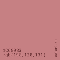 Цвет #C68083 в цветовой модели RGB обозначается тремя октетами (198, 128, 131) в десятичном формате и #C68083 в шестнадцатиричном (hex) формате, которые являются интенсивностью красного 198 (hex C6), интенсивность зелёного 128 (hex 80) и интенсивность синего 131 (hex 83).