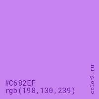 Цвет #C682EF в цветовой модели RGB обозначается тремя октетами (198, 130, 239) в десятичном формате и #C682EF в шестнадцатиричном (hex) формате, которые являются интенсивностью красного 198 (hex C6), интенсивность зелёного 130 (hex 82) и интенсивность синего 239 (hex EF).