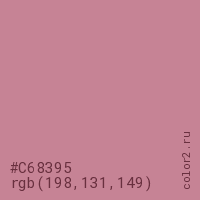 Цвет #C68395 в цветовой модели RGB обозначается тремя октетами (198, 131, 149) в десятичном формате и #C68395 в шестнадцатиричном (hex) формате, которые являются интенсивностью красного 198 (hex C6), интенсивность зелёного 131 (hex 83) и интенсивность синего 149 (hex 95).