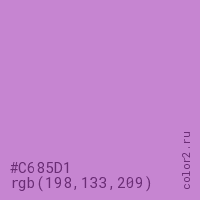 Цвет #C685D1 в цветовой модели RGB обозначается тремя октетами (198, 133, 209) в десятичном формате и #C685D1 в шестнадцатиричном (hex) формате, которые являются интенсивностью красного 198 (hex C6), интенсивность зелёного 133 (hex 85) и интенсивность синего 209 (hex D1).