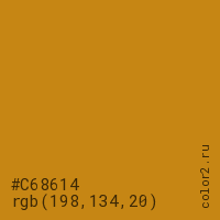Цвет #C68614 в цветовой модели RGB обозначается тремя октетами (198, 134, 20) в десятичном формате и #C68614 в шестнадцатиричном (hex) формате, которые являются интенсивностью красного 198 (hex C6), интенсивность зелёного 134 (hex 86) и интенсивность синего 20 (hex 14).