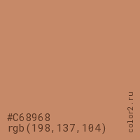 Цвет #C68968 в цветовой модели RGB обозначается тремя октетами (198, 137, 104) в десятичном формате и #C68968 в шестнадцатиричном (hex) формате, которые являются интенсивностью красного 198 (hex C6), интенсивность зелёного 137 (hex 89) и интенсивность синего 104 (hex 68).