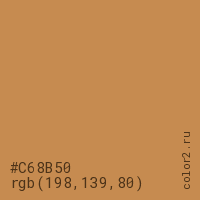 Цвет #C68B50 в цветовой модели RGB обозначается тремя октетами (198, 139, 80) в десятичном формате и #C68B50 в шестнадцатиричном (hex) формате, которые являются интенсивностью красного 198 (hex C6), интенсивность зелёного 139 (hex 8B) и интенсивность синего 80 (hex 50).