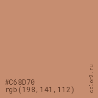Цвет #C68D70 в цветовой модели RGB обозначается тремя октетами (198, 141, 112) в десятичном формате и #C68D70 в шестнадцатиричном (hex) формате, которые являются интенсивностью красного 198 (hex C6), интенсивность зелёного 141 (hex 8D) и интенсивность синего 112 (hex 70).