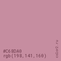 Цвет #C68DA0 в цветовой модели RGB обозначается тремя октетами (198, 141, 160) в десятичном формате и #C68DA0 в шестнадцатиричном (hex) формате, которые являются интенсивностью красного 198 (hex C6), интенсивность зелёного 141 (hex 8D) и интенсивность синего 160 (hex A0).