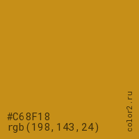 Цвет #C68F18 в цветовой модели RGB обозначается тремя октетами (198, 143, 24) в десятичном формате и #C68F18 в шестнадцатиричном (hex) формате, которые являются интенсивностью красного 198 (hex C6), интенсивность зелёного 143 (hex 8F) и интенсивность синего 24 (hex 18).