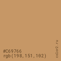 Цвет #C69766 в цветовой модели RGB обозначается тремя октетами (198, 151, 102) в десятичном формате и #C69766 в шестнадцатиричном (hex) формате, которые являются интенсивностью красного 198 (hex C6), интенсивность зелёного 151 (hex 97) и интенсивность синего 102 (hex 66).