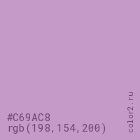 Цвет #C69AC8 в цветовой модели RGB обозначается тремя октетами (198, 154, 200) в десятичном формате и #C69AC8 в шестнадцатиричном (hex) формате, которые являются интенсивностью красного 198 (hex C6), интенсивность зелёного 154 (hex 9A) и интенсивность синего 200 (hex C8).