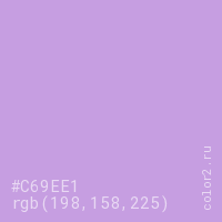 Цвет #C69EE1 в цветовой модели RGB обозначается тремя октетами (198, 158, 225) в десятичном формате и #C69EE1 в шестнадцатиричном (hex) формате, которые являются интенсивностью красного 198 (hex C6), интенсивность зелёного 158 (hex 9E) и интенсивность синего 225 (hex E1).