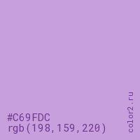 Цвет #C69FDC в цветовой модели RGB обозначается тремя октетами (198, 159, 220) в десятичном формате и #C69FDC в шестнадцатиричном (hex) формате, которые являются интенсивностью красного 198 (hex C6), интенсивность зелёного 159 (hex 9F) и интенсивность синего 220 (hex DC).