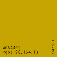 Цвет #C6A401 в цветовой модели RGB обозначается тремя октетами (198, 164, 1) в десятичном формате и #C6A401 в шестнадцатиричном (hex) формате, которые являются интенсивностью красного 198 (hex C6), интенсивность зелёного 164 (hex A4) и интенсивность синего 1 (hex 01).