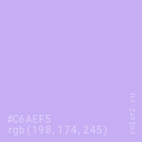Цвет #C6AEF5 в цветовой модели RGB обозначается тремя октетами (198, 174, 245) в десятичном формате и #C6AEF5 в шестнадцатиричном (hex) формате, которые являются интенсивностью красного 198 (hex C6), интенсивность зелёного 174 (hex AE) и интенсивность синего 245 (hex F5).