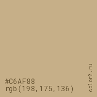 Цвет #C6AF88 в цветовой модели RGB обозначается тремя октетами (198, 175, 136) в десятичном формате и #C6AF88 в шестнадцатиричном (hex) формате, которые являются интенсивностью красного 198 (hex C6), интенсивность зелёного 175 (hex AF) и интенсивность синего 136 (hex 88).