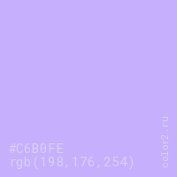 Цвет #C6B0FE в цветовой модели RGB обозначается тремя октетами (198, 176, 254) в десятичном формате и #C6B0FE в шестнадцатиричном (hex) формате, которые являются интенсивностью красного 198 (hex C6), интенсивность зелёного 176 (hex B0) и интенсивность синего 254 (hex FE).