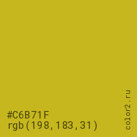 Цвет #C6B71F в цветовой модели RGB обозначается тремя октетами (198, 183, 31) в десятичном формате и #C6B71F в шестнадцатиричном (hex) формате, которые являются интенсивностью красного 198 (hex C6), интенсивность зелёного 183 (hex B7) и интенсивность синего 31 (hex 1F).