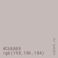 Цвет #C6BAB8 в цветовой модели RGB обозначается тремя октетами (198, 186, 184) в десятичном формате и #C6BAB8 в шестнадцатиричном (hex) формате, которые являются интенсивностью красного 198 (hex C6), интенсивность зелёного 186 (hex BA) и интенсивность синего 184 (hex B8).