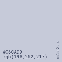 Цвет #C6CAD9 в цветовой модели RGB обозначается тремя октетами (198, 202, 217) в десятичном формате и #C6CAD9 в шестнадцатиричном (hex) формате, которые являются интенсивностью красного 198 (hex C6), интенсивность зелёного 202 (hex CA) и интенсивность синего 217 (hex D9).