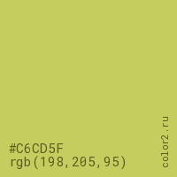 Цвет #C6CD5F в цветовой модели RGB обозначается тремя октетами (198, 205, 95) в десятичном формате и #C6CD5F в шестнадцатиричном (hex) формате, которые являются интенсивностью красного 198 (hex C6), интенсивность зелёного 205 (hex CD) и интенсивность синего 95 (hex 5F).