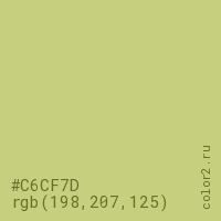 Цвет #C6CF7D в цветовой модели RGB обозначается тремя октетами (198, 207, 125) в десятичном формате и #C6CF7D в шестнадцатиричном (hex) формате, которые являются интенсивностью красного 198 (hex C6), интенсивность зелёного 207 (hex CF) и интенсивность синего 125 (hex 7D).