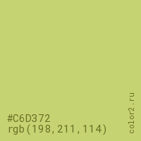 Цвет #C6D372 в цветовой модели RGB обозначается тремя октетами (198, 211, 114) в десятичном формате и #C6D372 в шестнадцатиричном (hex) формате, которые являются интенсивностью красного 198 (hex C6), интенсивность зелёного 211 (hex D3) и интенсивность синего 114 (hex 72).